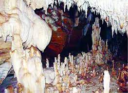 शिवालय से नीचे जाने पर एक के बाद एक तीन जलप्रपात या झरने मिलते हैं। पहला झरना तीस फिट उँचाई का है। इससे नीचे उतरने के बाद लगभग साढे तीन इंच चौड़ा, पैंतालीस इंच उँचा व 65 इंच लंबा एक अंधकारमय गलियारा मिलता है। इसके दाहिनी ओर चूने की चटटाने हैं, जिन पर जल के बहने के निशान तथा बांयी ओर बंद छत पर लटकते हुए स्तंभों के दर्शन होते हैं। इस गुफ़ा की सबसे ख़ास बात यह है कि यहाँ जो स्तंभ बने हैं, वह अपने आप प्राकृतिक तरीके से बने हैं। पानी की बूंदों के साथ जो कैल्सियम गिरता गया, उसने धीरे-धीरे स्तंभों का रूप ग्रहण कर लिया और अब गुफ़ा में चमकते हुए स्तम्भ दिखाई देते हैं। इस गुफ़ा के पत्थरों को आकाशवाणी केन्द्र ने वादय यंत्रों की तरह इस्तेमाल किया था, इनसे विभिन्न तरह के स्वर निकाले गए थे।